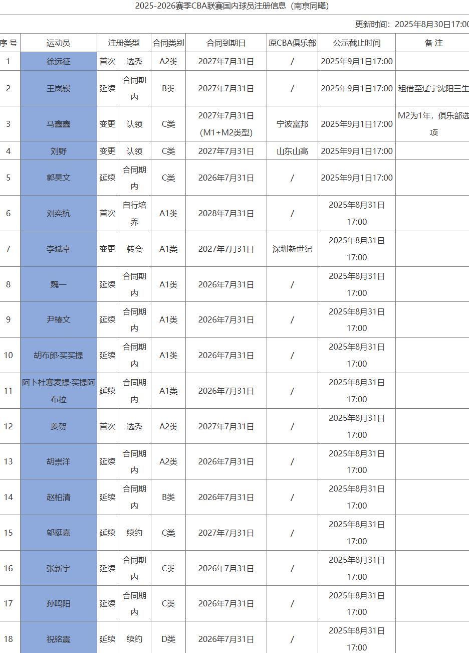 2025年8月30日CBA多支球队的注册获得了更新,其中新疆青春风暴,现在他们已经注册了14个人,其中殷召航、冯傲、张庆泽上调一队,球队存在了一半的年轻球员,这对于刘炜的压力还是比较大的,他需要担负起年轻球员的培养。
